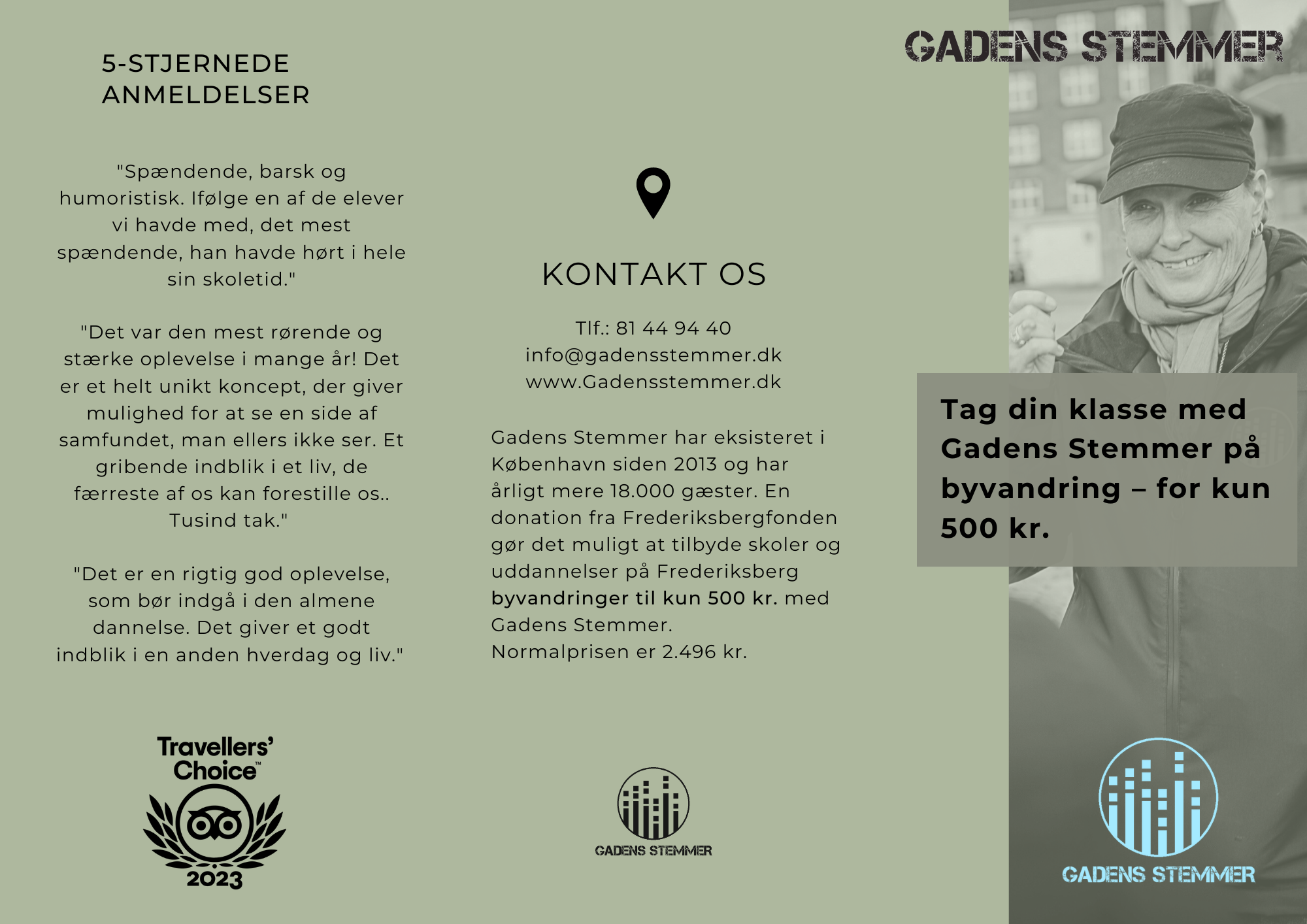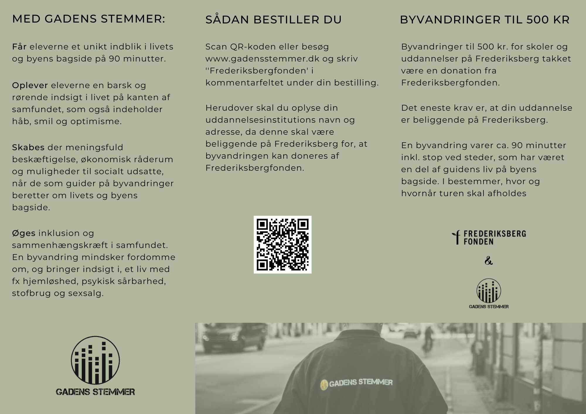 En donation fra Frederiksbergfonden gør det muligt, at tilbyde skoler og uddannelsesinstitutioner med adresse på Frederiksberg byvandringer til kun 500 kr. med Gadens Stemmer. Læs herunder hvordan du bestiller.